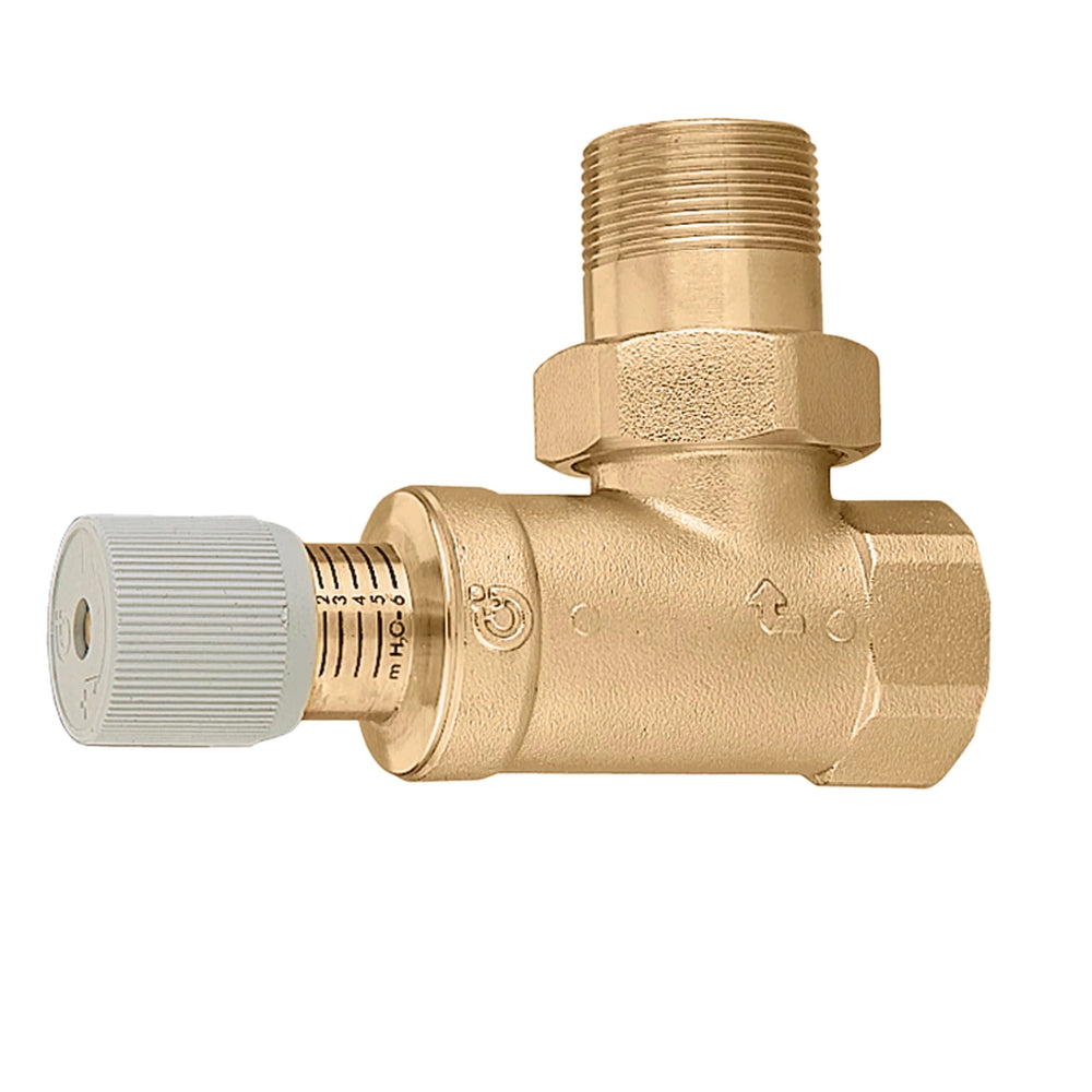 Този регулируем байпасен вентил за диференциално налягане осигурява постоянни работни условия в отоплителни и охладителни кръгове с променливи дебити. Той връща излишния дебит пропорционално на броя на затворените консуматори, като по този начин ограничава диференциалното налягане, генерирано от помпата.