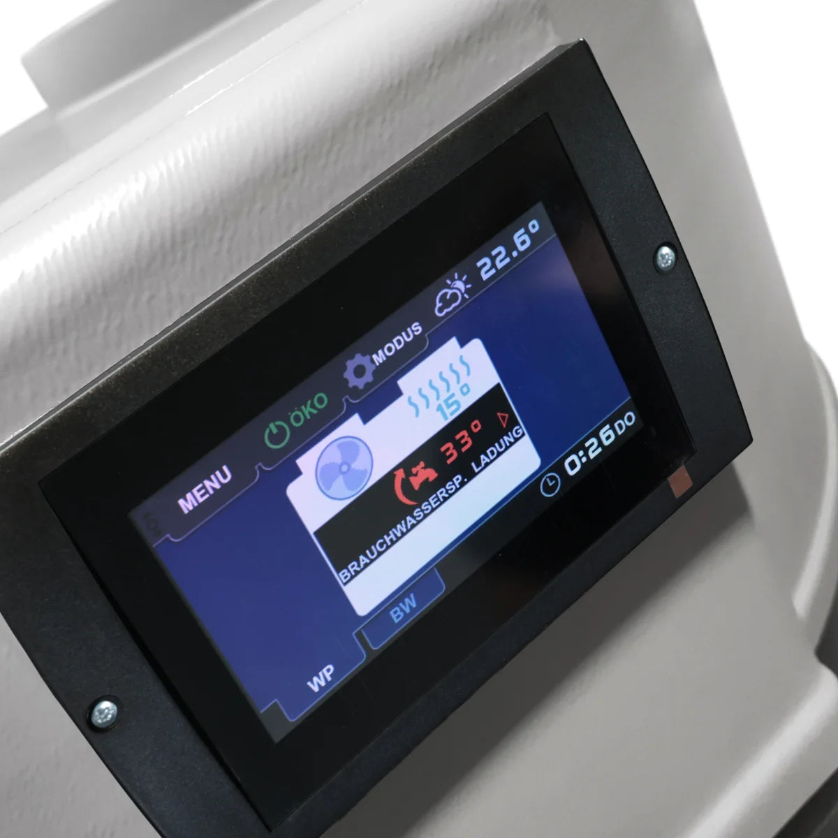 The heat pump is operated via a manual control panel with a graphic display (M) or, optionally, an intuitive color touch panel (D). The user-friendly interface allows for quick adjustment of all operating parameters and a clear display of temperatures and time programs.