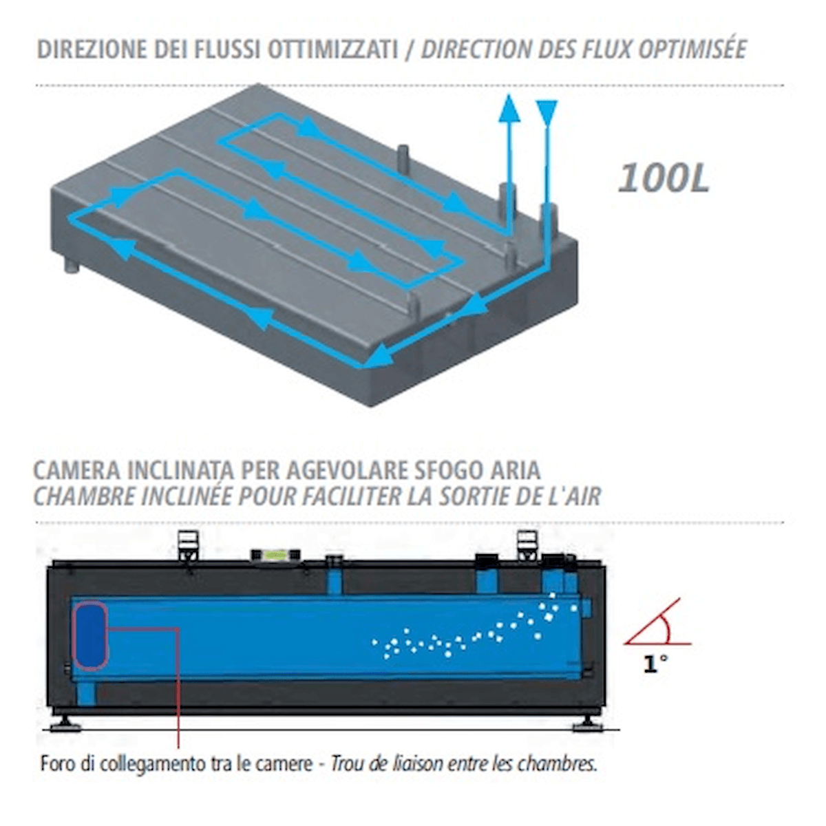 BOMBER 100B is the new and innovative, ultra-flat, rectangular buffer tank with a capacity of 100 liters, which guarantees the minimum water content in the system for the correct operation of the heat pump.