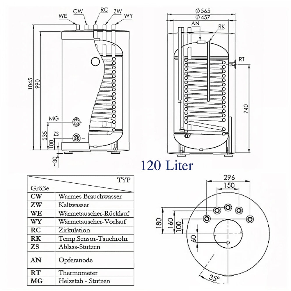 The Hot water tank with 120 liters Volumen impresses with its central and safe hot water heating, which is ideal for the daily need for hot and drinking water Equipped with an integrated heat exchanger, it offers reliable operation for Domestic water and drinking water, combining comfort and efficiency in one device.