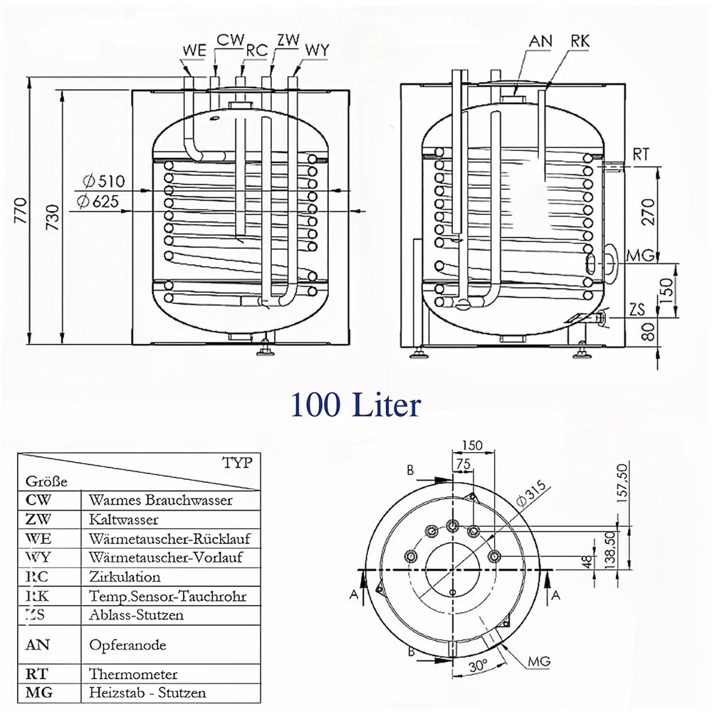 TĂ©rfogat: 100 liter; HƑcserĂ©lƑ felĂŒlet: 1,2 mÂČ; HƑcserĂ©lƑ kapacitĂĄs: 5,27 liter. Az elƑremenƑ, visszatĂ©rƑ Ă©s keringtetƑ csatlakozĂĄsok egyenkĂ©nt 3/4" AG, kiegĂ©szĂ­tve egy 1 1/-essel4" IG csatlakozĂĄs a magnĂ©ziumanĂłdhoz Ă©s egy 1 1/2" IG csatlakozĂĄs az elektromos fƱtƑelemhez.