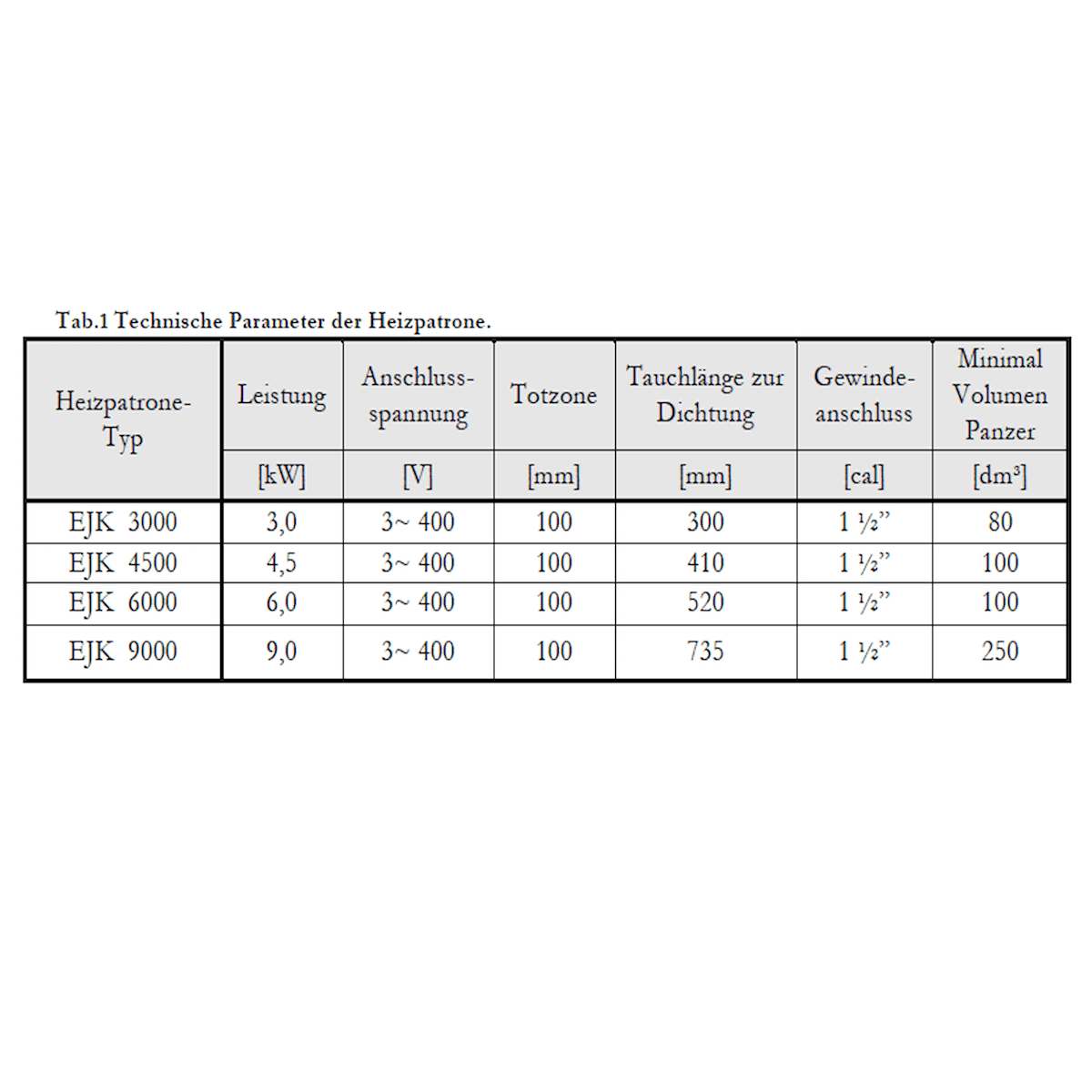 La cartuccia riscaldante del pacchetto completo è disponibile in diverse classi di potenza, specificamente progettate per 1,5 kW, 2,0 kW, 3,0 kW a 230 V e 4,5 kW, 6,0 kW e 9,0 kW a 400 V. Queste varianti consentono un adattamento ottimale al fabbisogno energetico individuale dell'impianto di riscaldamento.