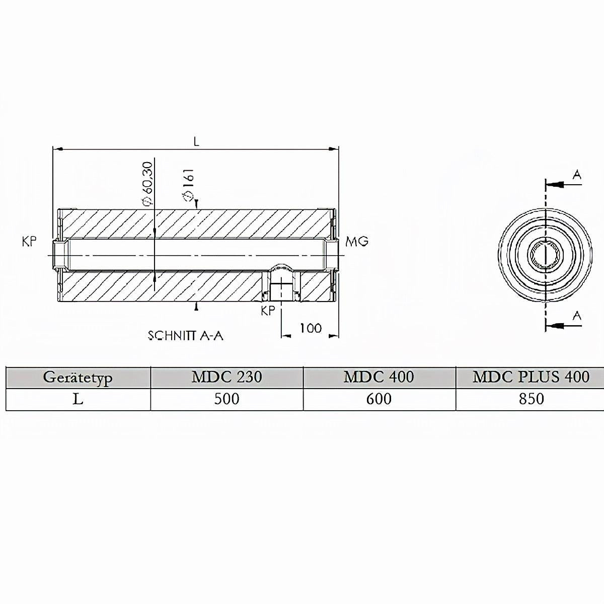• Dimensioni MDC400 (diametro x lunghezza): 161 mm x 600 mm