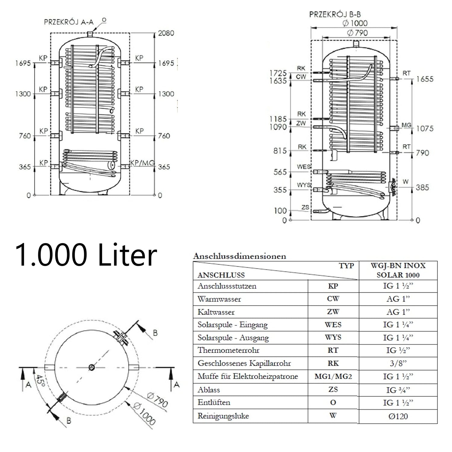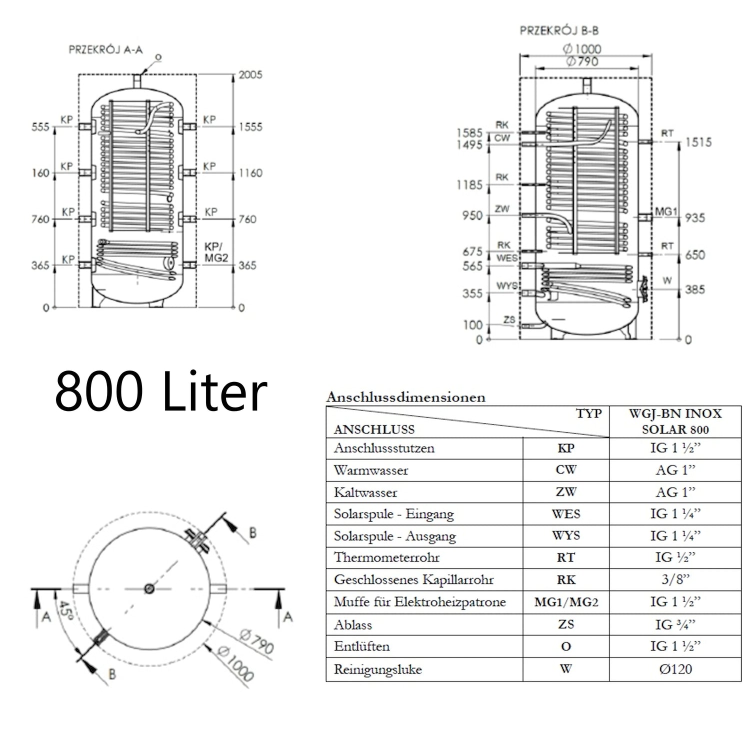 Il WGJ-BN INOX SOLAR è un serbatoio di accumulo combinato per il riscaldamento e l'acqua calda sanitaria con serpentina di riscaldamento in acciaio inox integrata come scambiatore di calore. È progettato per l'integrazione in impianti di riscaldamento centralizzati con caldaie, pompe di calore o per l'utilizzo del calore solare e consente sia l'accumulo di energia termica che il riscaldamento continuo di acqua potabile.