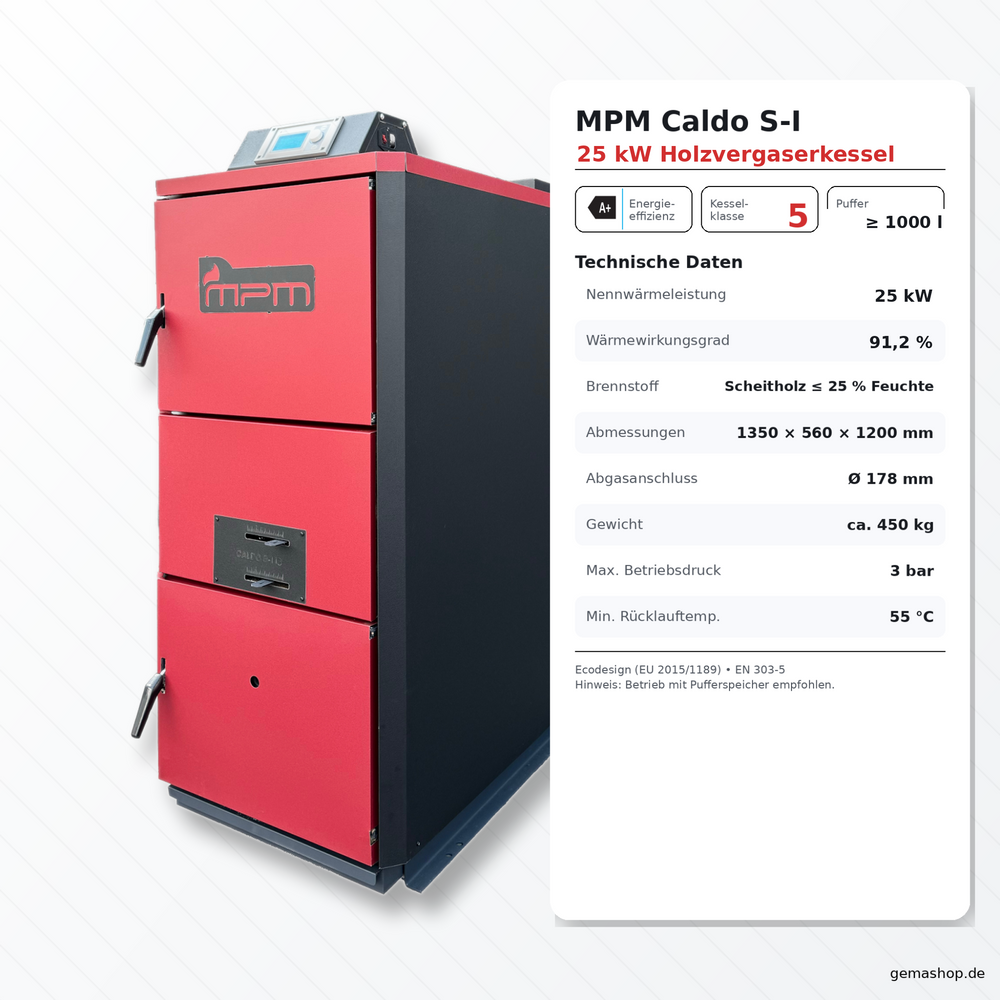 „MPM Caldo SI 25 kW“ yra medienos dujofikavimo katilas su keraminiu degikliu. Jo konstrukcija skatina efektyvų degimą su maža emisija ir yra skirta darbui su buferine talpa bei grįžtamosios temperatūros pakėlimu – idealiai tinka didesniems vienos šeimos namams arba katilinėms, kurioms reikalingas didesnis šilumos išeikvojimas.