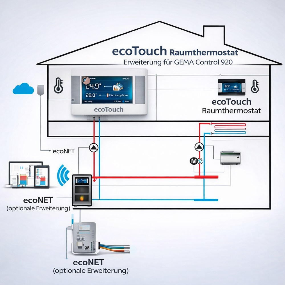 Стайният термостат PLUM ecoTouch значително разширява възможностите на вашата система за управление на отопление Gema CONTROL 920. Той е идеален за домакинства, които се нуждаят от по-прецизен контрол на температурата или контрол на множество стаи. Това разширение не само подобрява комфорта на живот, но и помага за оптимизиране на потреблението на енергия, като позволява температурата да се регулира прецизно според вашите нужди.