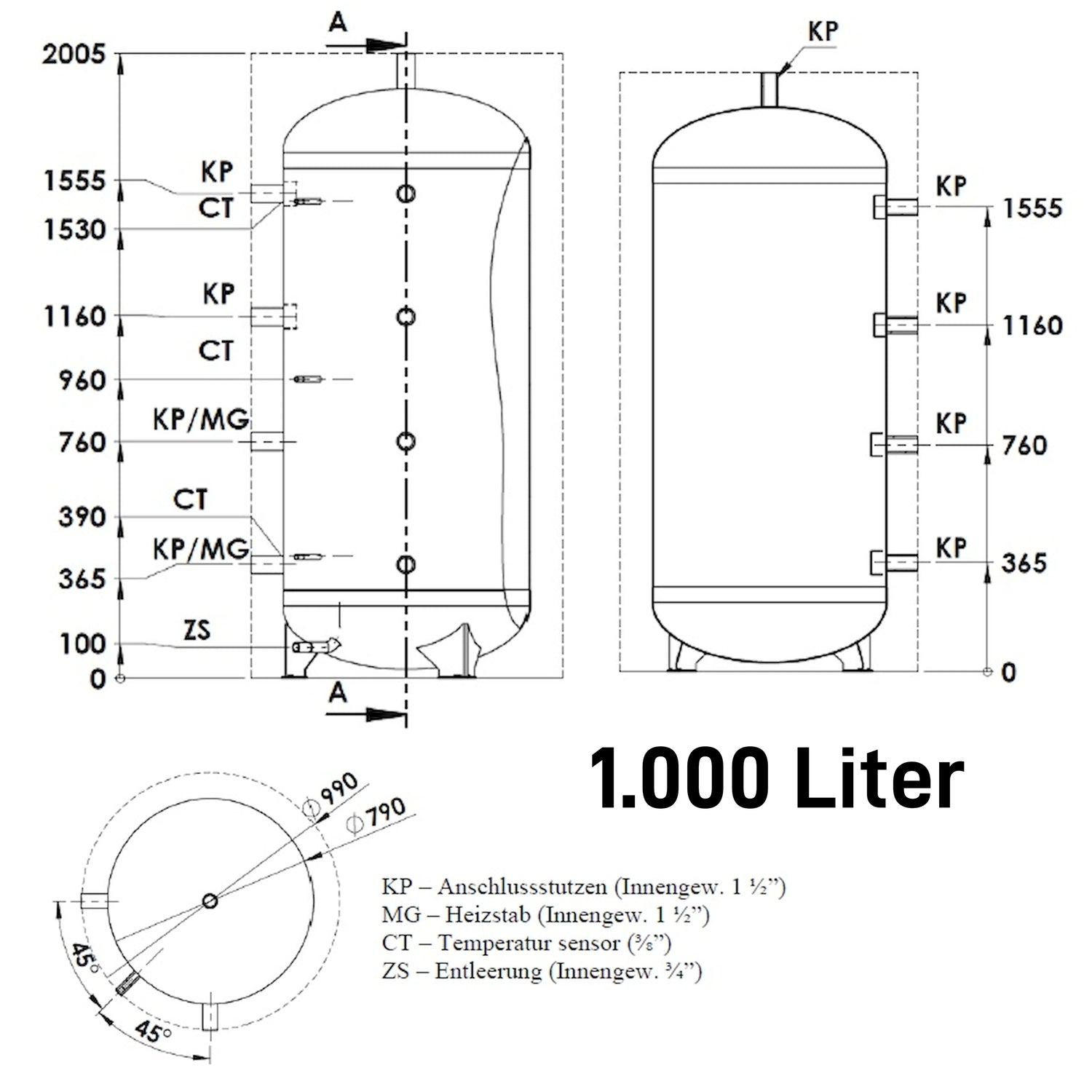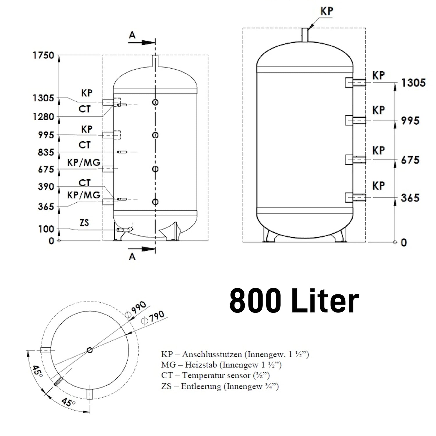 Anslutningsmått: Anslutningsstycke (KP) invändig gänga 1½", värmeelementanslutning (MG) invändig gänga 1½", temperatursensoranslutning (CT) 3/8", Avlopp (ZS) invändig gänga 3/4".